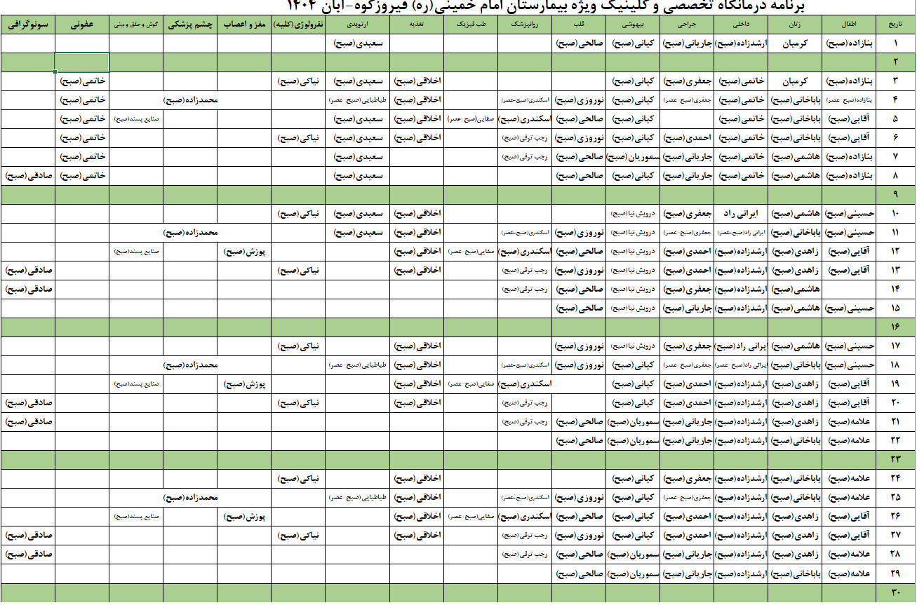 برنامه حضور پزشکان در کلینیک ویژه تخصصی بیمارستان امام خمینی(ره) فیروزکوه - آبان 1404